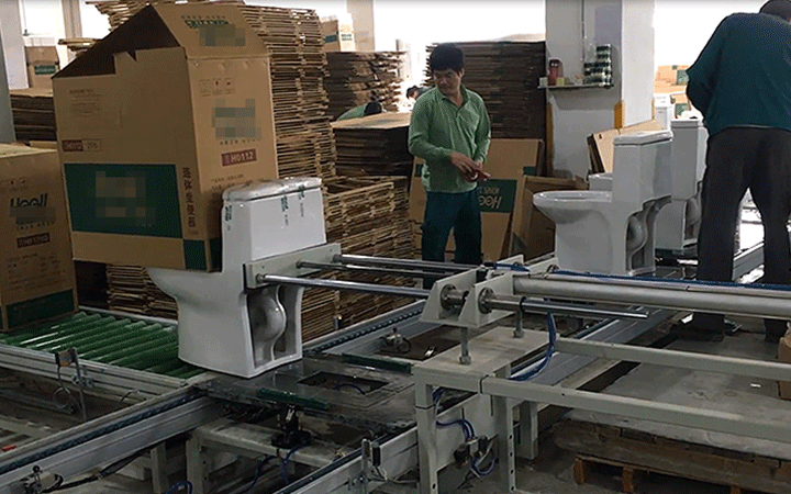 釉坯通過自動輸送線、升降機、頂升平移機進行成瓷儲存、檢測外觀和測漏、水件安裝、分級試水等各項工序均為線上操作。馬桶測漏采用真空測漏器進行真空檢測產品是否漏氣,從而判斷是否漏水;采用觸摸控制系統可記錄產品的合格數量及合格率。馬桶測試線優化各個工序的人員分配,節約了空間,提高了各個工序人工效率。