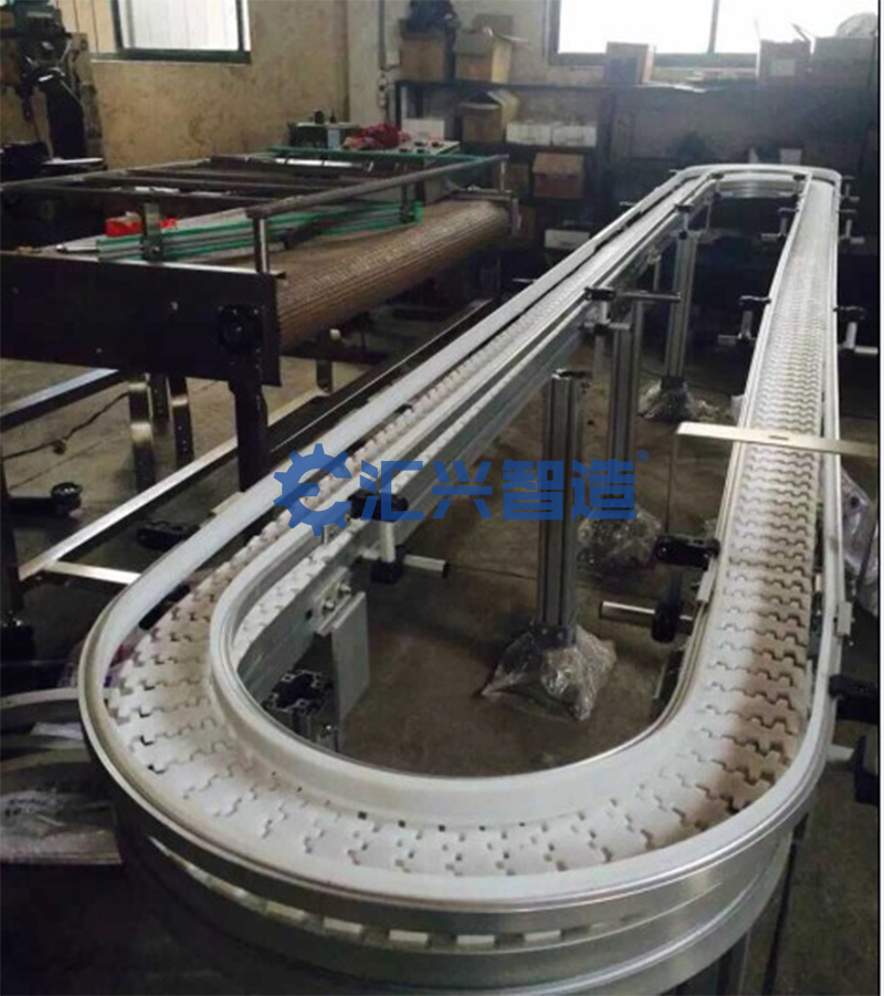 組成:頂板鏈輸送機以標準頂板鏈為承載面,由馬達減速機為動力傳動,運行在專用導軌中,根據工藝流程不同,頂板鏈分為轉彎及直線型。