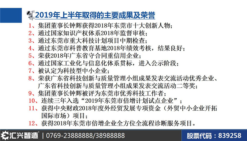 大會(huì)第五項(xiàng)議程知識(shí)產(chǎn)權(quán)部經(jīng)理蔣明華“年上半年取得的主要成果匯報(bào)”。實(shí)力見證榮耀,品質(zhì)鑄就輝煌。公司始終牢記“做受尊敬的好人、造受尊敬的產(chǎn)品、辦受尊敬的企業(yè)、建受尊敬的平臺(tái)”的企業(yè)使命,砥礪奮進(jìn),載譽(yù)而歸。這些榮譽(yù)既是對(duì)匯興智造年上半年成就的肯定,又是對(duì)未來(lái)發(fā)展的勉勵(lì)!