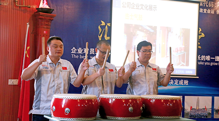 會議由行政部經(jīng)理袁侃主持。會議在激昂的《匯興之歌——用心智造世界》 拉開帷幕,全體參會人員向企業(yè)核心價值觀“孝道、商道、人道”行三鞠躬禮,宣讀企業(yè)愿景——成為全球領(lǐng)先的整廠自動化系統(tǒng)解決方案提供商,企業(yè)使命——做受尊敬的好人、造受尊敬的產(chǎn)品、辦受尊敬的企業(yè)、建受尊敬的平臺,企業(yè)精神——用情做人、用心做事,團隊精神——忠誠團結(jié)、勤奮進(jìn)取。隨后,匯興智造干部職員代表鐘建輝、彭大海,鄭建團共同敲響士氣鼓,鼓舞匯興智造牢記初心,砥礪前行。