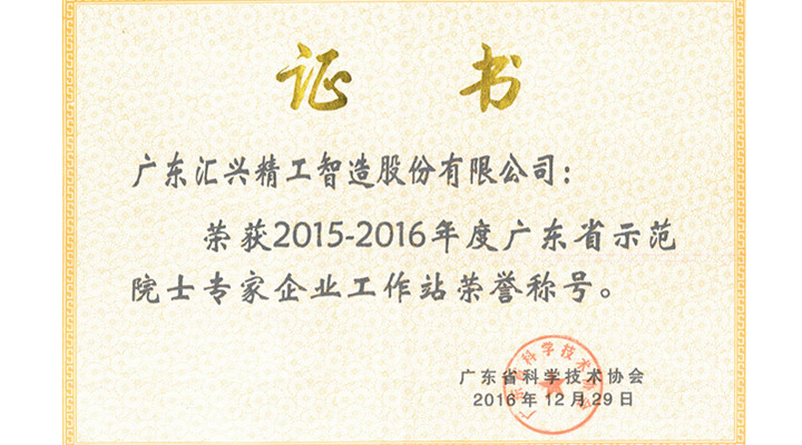 匯興智造榮獲2015-2016年度廣東省示范院士專家企業(yè)工作站榮譽(yù)稱號