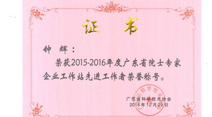 匯興智造董事長鐘輝榮獲2015-2016年度廣東省院士專家企業(yè)工作站先進(jìn)工作者。