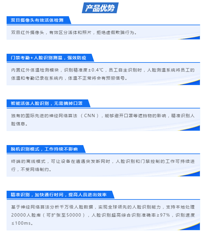 用國際先進(jìn)的神經(jīng)網(wǎng)絡(luò)算法 (CNN), 是經(jīng)數(shù)千萬次的算法訓(xùn)練后形成的產(chǎn)品,其集圖像采集、人臉檢測、人臉跟蹤和人臉比對等功能,不僅識別率高,同時識別速度快。值得一提的是,這款設(shè)備可以輕松識別出戴口罩的人臉信息,非常適合作為此次疫情防控的有力工具。