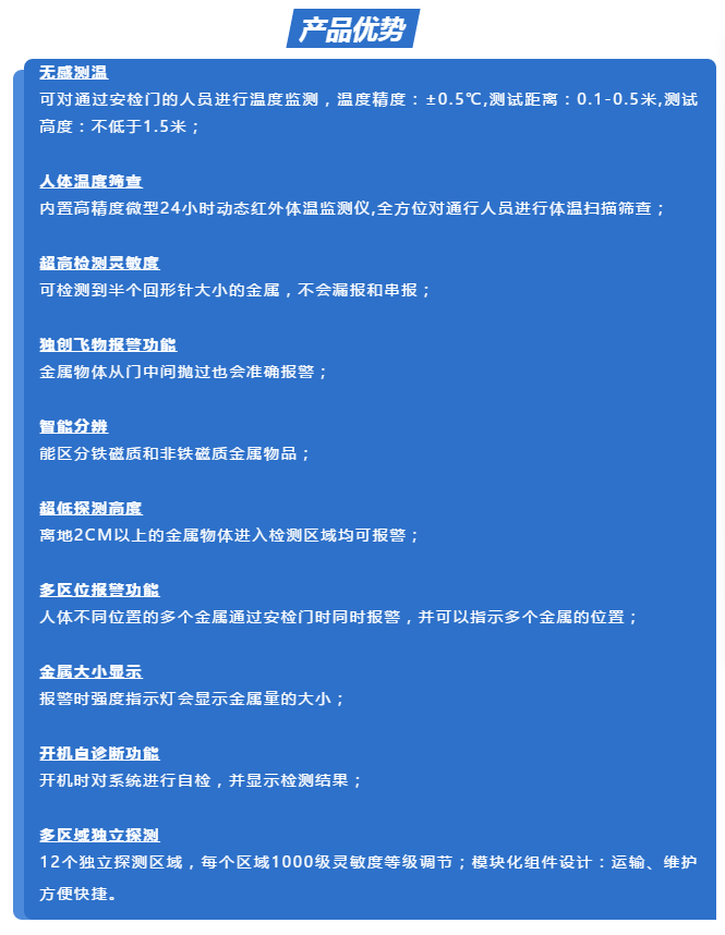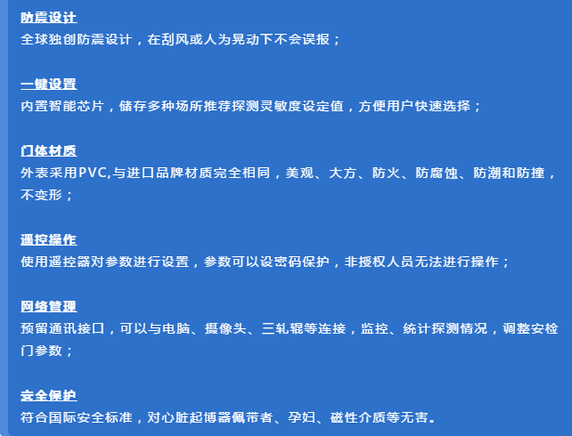 該設(shè)備采用世界先進(jìn)的電磁兼容設(shè)計和抗震動設(shè)計,具有超高靈敏度、極強(qiáng)的抗干擾能力和抗震能力,適用于管制刀具和槍支等危險物品的安全檢查,廣泛應(yīng)用于監(jiān)獄、法院、學(xué)校、醫(yī)院、電子企業(yè)、港口、客運站、展覽會館、會議中心、重大慶典、演唱會等重要場所。