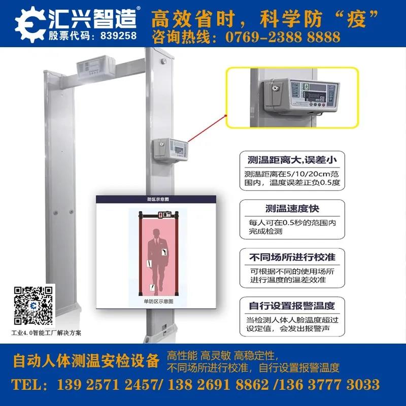 匯興智造人體測溫安檢門將集紅外測溫和金屬檢測為一體化,可對通過安檢門的人員進行溫度測試,如若超過安全溫度閾值將聯動安檢門聲光報警,有效對人員進行篩查并建立首道防線。
