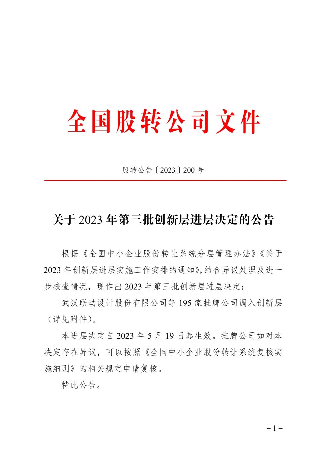 全國中小企業股份轉讓系統有限責任公司于2023年5月17日在其官網發布的《關于2023年第三批創新層進層決定的公告》(股轉公告【2023】 200 號),廣東匯興精工智造股份有限公司(股票代碼:839258)憑借持續增長的經營業績從眾多基礎層掛牌公司中脫穎而出,2023年5月19日正式進入新三板創新層,邁向更高層次的資本舞臺。