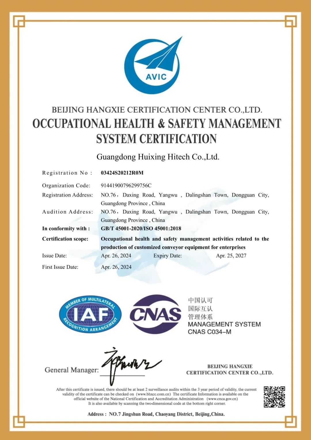 “做受尊敬好人,造受尊敬的產品,辦受尊敬的企業,建受尊敬的平臺”是匯興智造的企業使命。4月7-9日,廣東匯興精工智造股份有限公司通過北京航協認證中心審核組進行為期3天的ISO14001環境管理體系和ISO45001職業健康安全管理體系認證,經過主管機構全面、嚴格、細致的審核,公司各項審核項目均已達到ISO14001環境管理體系和ISO45001職業健康安全管理體系標準要求,并于2024年4月26日正式獲得ISO14001環境管理體系和ISO45001職業健康安全管理體系認證證書。