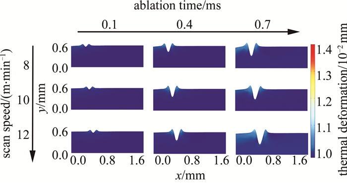 圖 7是以掃描速率為變量的仿真結(jié)果。分別選取8 m/min, 10 m/min, 12 m/min為參數(shù)節(jié)點(diǎn),其余加工參數(shù)如下:激光功率為60 W、重復(fù)頻率為100 kHz。燒蝕時(shí)間節(jié)點(diǎn)選擇與圖例設(shè)置同圖 6。觀察圖 7發(fā)現(xiàn),掃描速率為8 m/min時(shí),保護(hù)橡膠產(chǎn)生的熱變形較大。這是因?yàn)閽呙杷俾实脑龃髸?huì)引起脈沖重疊率的減小,且會(huì)明顯降低激光刻型過(guò)程中熱效應(yīng)的累積現(xiàn)象,同時(shí)也會(huì)減小切口的熱變形程度。
