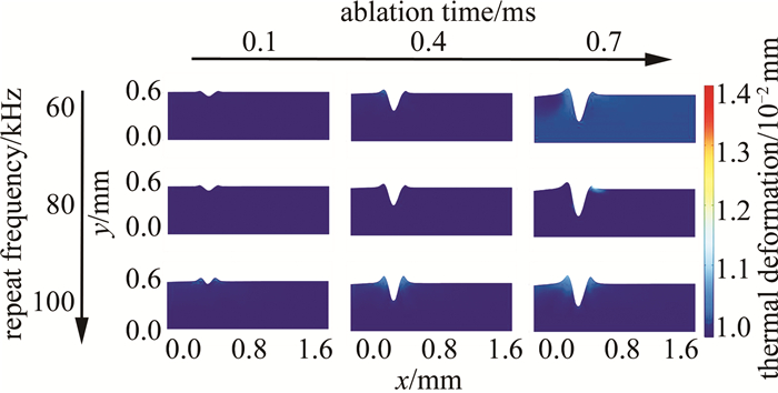圖 8是以重復(fù)頻率為變量的仿真結(jié)果。分別選取60 kHz、80 kHz、100 kHz為參數(shù)節(jié)點(diǎn), 其余仿真條件如下:激光功率為60 W、掃描速率為10 m/min。燒蝕時(shí)間節(jié)點(diǎn)選擇與圖例設(shè)置同圖 6。觀察圖 8發(fā)現(xiàn),掃描時(shí)間恒定時(shí),重復(fù)頻率以選取的參數(shù)節(jié)點(diǎn)變化; 重復(fù)頻率為60 kHz、80 kHz時(shí),切口形貌、燒蝕深度無(wú)明顯變化,當(dāng)重復(fù)頻率達(dá)到100 kHz時(shí),形貌變化較明顯,且切口處產(chǎn)生了較大的熱變形現(xiàn)象。
