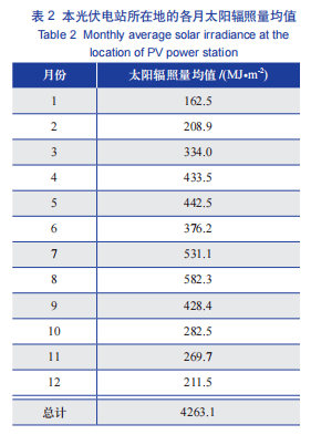 根據本光伏電站所在地多年內各月太陽輻照量數據,求平均值后可得到各月太陽輻照量均值, 具體如表 2 所示。